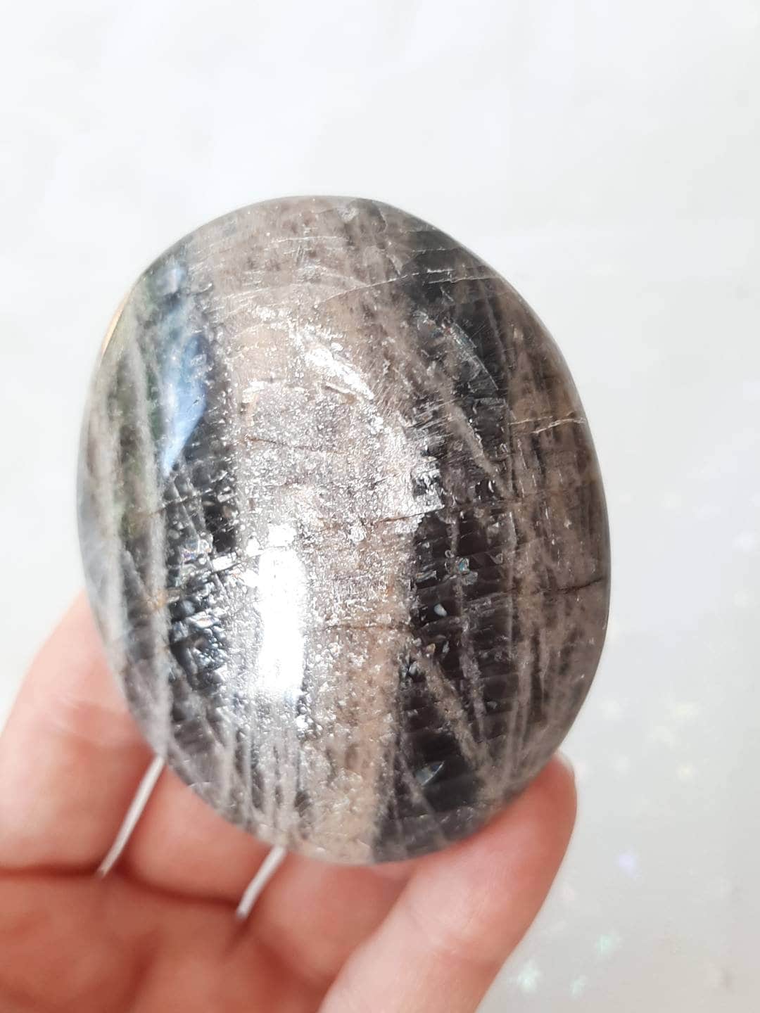 This black moonstone palm stone has rainbow and silver flash. From Madagascar, it measures approximately 6.5 cm x 5 cm x 2.5 cm and weighs 104g.